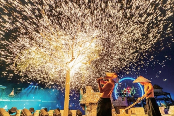 在九頂塔中華民族歡樂園內(nèi),每天30余項(xiàng)歌舞表演、民間絕技,300場次異域風(fēng)情和少數(shù)民族風(fēng)情演出分別在非洲部落、苗寨、傣寨、佤寨、彝寨、侗寨等十余個(gè)民族村寨循環(huán)上演。夜幕降臨,大型篝火晚會《香格里拉之夢》點(diǎn)燃夜空下最熱烈的激情,30多個(gè)風(fēng)情歌舞接續(xù)上演,現(xiàn)場更有精彩絕倫的“火龍鋼花”震撼演出。再加上各項(xiàng)實(shí)景演出,游客穿梭于不同場景中,既是觀眾,又是“親歷者”,沉浸式體驗(yàn)一場不落幕的文化盛宴。