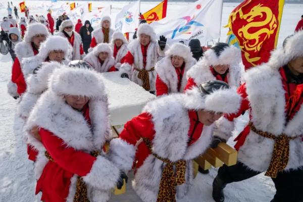 人們簇擁著將采下的第一塊頭冰用紅布包裹著送到舞臺中央,祈福詞、出征酒、采頭冰、系鴻運……一系列獨特的民俗儀式讓現場的市民、游客興奮不已。火熱的采冰活動不僅“燃動”松花江面,也成為游客享受冰上運動與特色美食的熱門“打卡地”。江水煮餃子、江水燉江魚、美味凍貨冰雪宴讓中外游客樂在其中。結合了冰雪特色的文旅體驗活動和文創產品也為采冰節增添了時尚元素。
