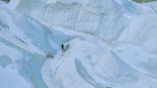 隨著海西蒙古族藏族自治州冬春季旅游系列活動拉開帷幕,地處柴達木盆地北緣、祁連山系吐爾根達坂山東端的敦德冰川成為眾多越野和攝影愛好者的詩與遠方。敦德冰川又稱敦德冰帽,是西北地區最大的平頂冰川,面積達57.07平方公里,其頂部海拔達5290米。圖為游客拍照。