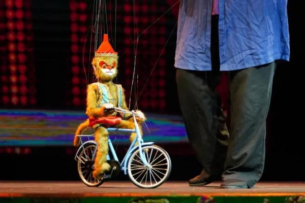 還有許多巧思藏在細(xì)節(jié)中。《猴趣》演員沈蘇革舉起手中的猴子木偶說:“現(xiàn)在的舞臺(tái)較大,為了讓更多觀眾看到木偶頭部細(xì)節(jié)表情變化,需要不斷改良木偶細(xì)節(jié)。這個(gè)猴子木偶頭的五官更加突出、嘴巴和眼睛的開合幅度更大、制作猴毛的材料更長、質(zhì)感也更好,舞臺(tái)上的表現(xiàn)力更強(qiáng)。”