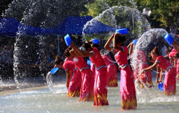 云南多個(gè)縣市都打造了潑水廣場(chǎng)、每年制定潑水節(jié)日程,安排賽龍舟、中外大趕擺、音樂會(huì)等活動(dòng)。在西雙版納州景洪市傣族園景區(qū),每天都會(huì)開展?jié)娝駳g,游客一年四季都能體驗(yàn)潑水節(jié)的快樂。