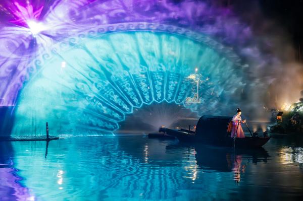 揚州古運河畔,全國首個全景式大型沉浸演藝“大運揚州”正在上演。游客乘船行進中,五大歷史篇章通過聲、光、電、水、火、投影、機械、飛行器及伴行船等十余種手段次第展開。3D Mapping秀將千年運河史投射于真實水岸,游客仿佛穿越至隋唐漕運的繁忙場景。而僅一街之隔的東關街上,《創世山海經》數字藝術展正引發新熱潮——AR技術掃描書頁,明代彩繪本中的神獸便“破卷而出”,九尾狐踏月而行,饕餮自巖壁躍出,配合5.1環繞聲效與地面互動投影,打造“人在畫中游”的奇幻世界。
