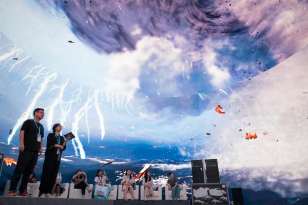 國內(nèi)首個MR劇游式導覽系統(tǒng)《黑暗傳與大富翁》成為展會焦點。觀眾戴上MR設備后,仰頭能看到展館穹頂幻化為浩瀚星空,數(shù)十米高的盤古大神跨越人群,靈動的七色鹿在腳邊跳躍。