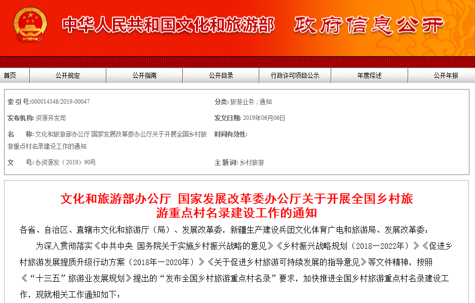 文化和旅游部將在全國遴選一批符合文化和旅游發展方向、資源開發和產品建設水平高、具有典型示范的鄉村,啟動全國鄉村旅游重點村名錄建設工作。