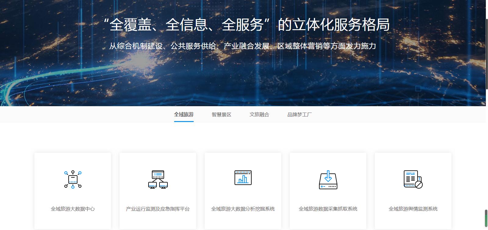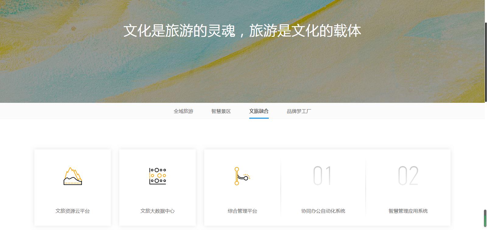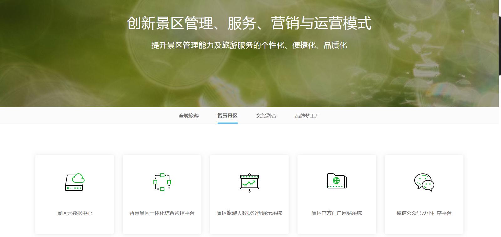 該產(chǎn)品模塊主要分為全域旅游、智慧景區(qū)、文旅融合、品牌夢(mèng)工廠四大模塊,從硬件軟件到系統(tǒng)開(kāi)發(fā),從文案策劃到設(shè)計(jì)創(chuàng)新,所有產(chǎn)品一應(yīng)俱全,分類清晰,方便客戶針對(duì)自身需求尋找對(duì)應(yīng)的產(chǎn)品。