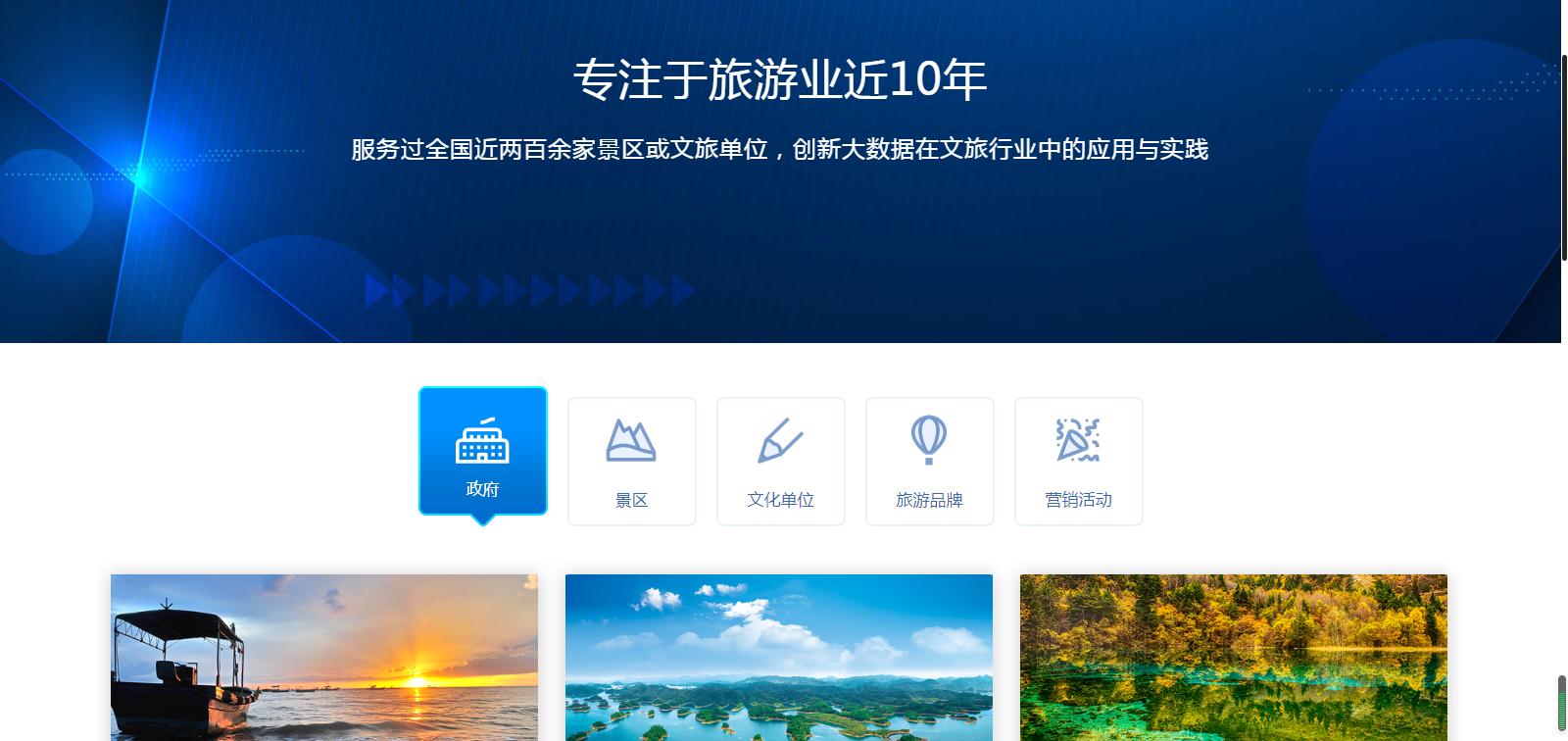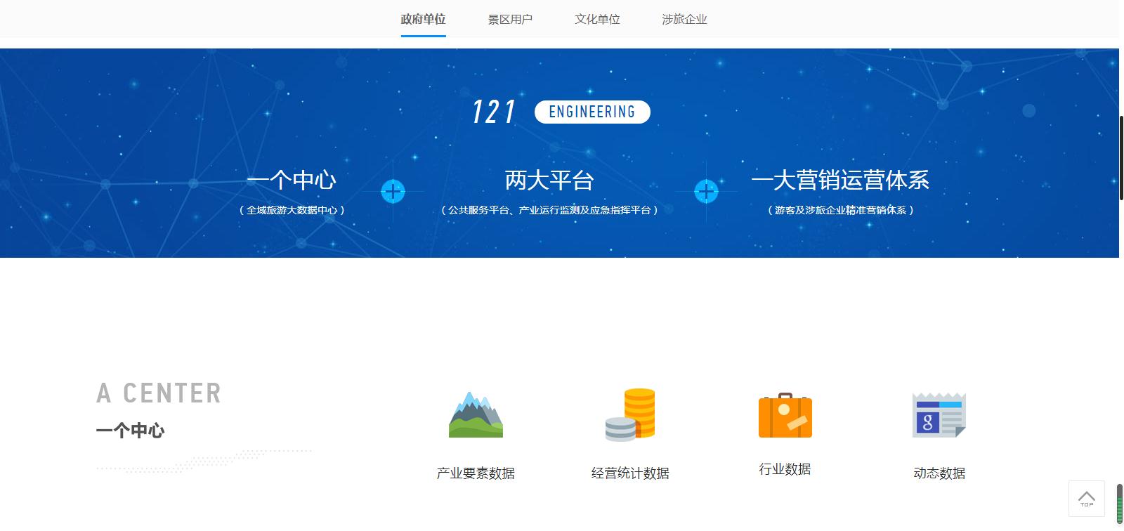 針對(duì)不同用戶屬性,分為政府單位、景區(qū)用戶、文化單位、涉旅企業(yè)。為不同行業(yè)客戶及合作伙伴,提供更為詳盡的方案支持,如政府單位的全域旅游“121工程”、景區(qū)用戶的“1234 M”技術(shù)、文化單位的服務(wù)平臺(tái)建設(shè)體系、涉旅企業(yè)的電子商務(wù)系統(tǒng)和活動(dòng)營(yíng)銷平臺(tái)。